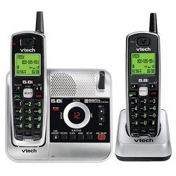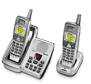 2.4 GHz FHSS (frequency-hopping digital spread spectrum) * includes 2 handsets, main telephone base, and charger stand for second handset * built-in digital answering machine with 15 minutes total record time * both handsets include: * 3-line LCDs * speakerphones * lighted keypads * jack for optional headset