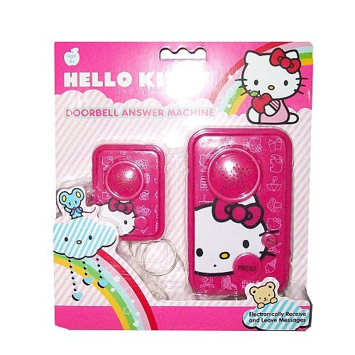 The Hello Kitty 28009-TRU Doorbell Answering Machine is designed for Hello Kitty Lovers. It's a user friendly and fun device that is a combination of a doorbell and an answering machine that you or anyone in the family can use. The doorbell rings and alert you if you have visitors in your front door and this Hello Kitty 28009-TRU Doorbell Answering Machine allows you to electronically leave and receive messages.